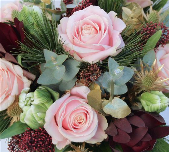 A muted deep red and pastel pink Christmas hand-tied bouquet including six long stemmed pink roses and gold highlights.