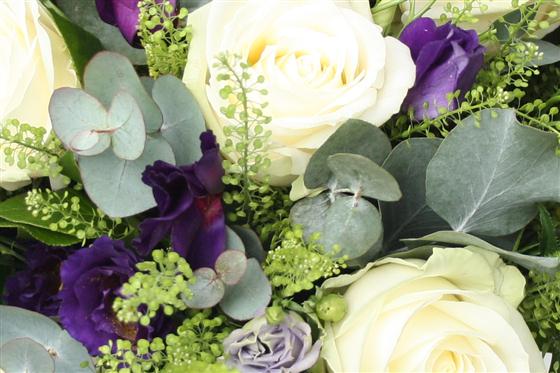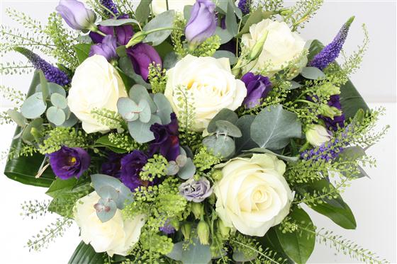 Crips whites and rich purples, a classic colour combination. This stylish bouquet includes roses, veronica and lisianthus.