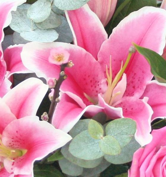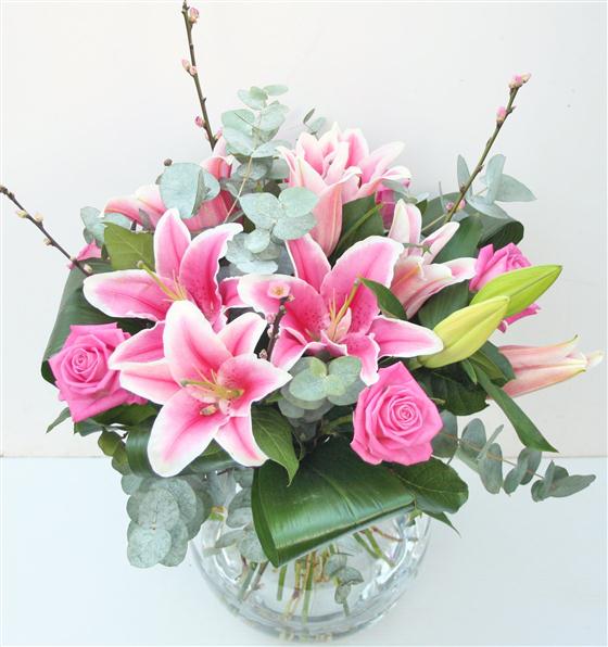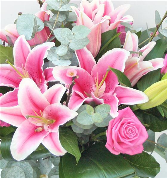 A beautiful bouquet that includes large pink oriental lily's and pink roses finished with pink cherry blossom and eucalyptus.
